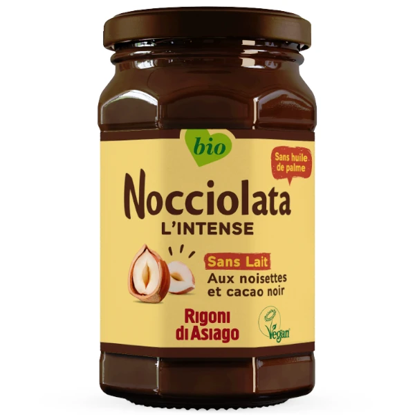Nocciolata L’Intense est une pâte à tartiner Bio au cacao et aux noisettes, sans lait. Elle dérive d’une recette exclusive, pensée pour les personnes intolérantes au lactose ou qui suivent un régime végan. Un produit savoureux et naturel, qui se distingue par son goût particulièrement intense. Il ne contient que les meilleurs ingrédients biologiques, pas d’huile de palme et de graisses hydrogénées, ni arômes, conservateurs, colorants et pas de gluten non plus. Grâce à un processus de transformation délicat, Nocciolata L’Intense a une texture onctueuse et facile à tartiner.