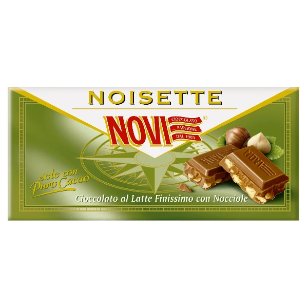 Savourez la rencontre parfaite entre le chocolat au lait onctueux et le croquant des noisettes entières avec la Tavoletta Noisette al Latte Novi.
