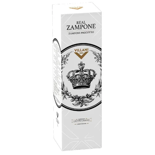 Le Real Zampone précuit Villani 900g est une spécialité italienne traditionnelle emblématique des repas festifs. Élaboré à partir de viande de porc finement assaisonnée puis embossée dans une couenne naturelle, ce zampone offre une texture tendre, un goût riche et savoureux, et une préparation simple grâce à sa cuisson préalable.