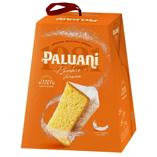 Le Pandoro di Verona Paluani incarne la douceur et la tradition italienne des fêtes. Préparé selon la recette originale de Vérone, ce gâteau moelleux et doré est réalisé avec des ingrédients de qualité et une levure naturelle qui lui confèrent une texture légère et un parfum délicat de vanille.